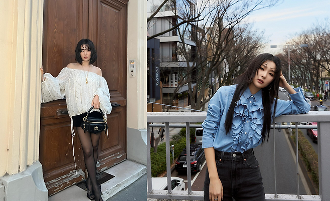 마지막 사진에서는 오프숄더 화이트 블라우스와 블랙 미니 스커트를 매치해 로맨틱하면서도 시크한 분위기를 연출했다. 여기에 블랙 스타킹과 힐, 그리고 골드 디테일이 돋보이는 핸드백을 더해 우아함을 강조했다. 도어 프레임 배경과 어우러진 스타일링은 도시적이고 세련된 이미지를 부각시킨다.