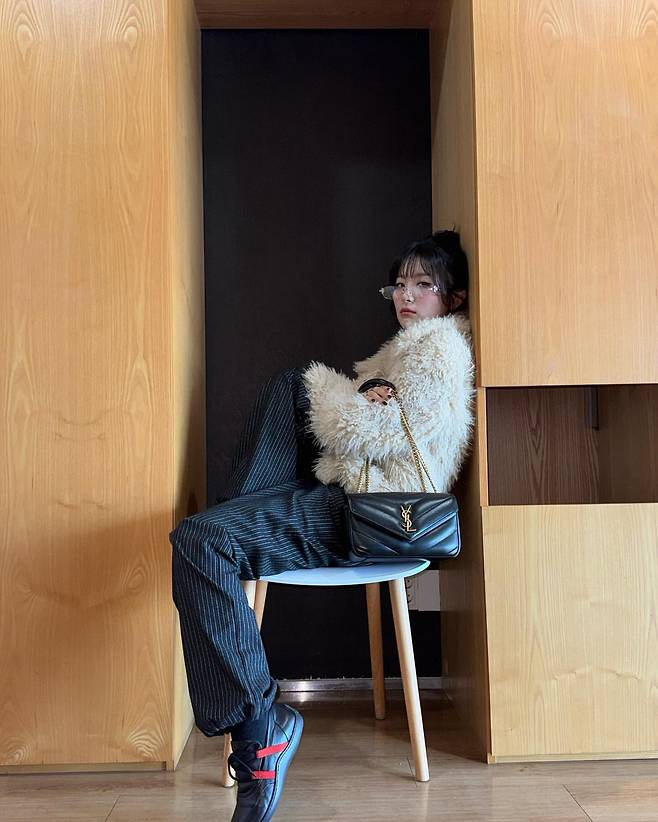 슬기는 퍼 소재의 크림색 상의와 스트라이프 패턴의 와이드 팬츠를 매치해 편안하면서도 세련된 분위기를 연출했다. 여기에 블랙 컬러의 생로랑 체인백과 포인트가 들어간 스니커즈를 더해 캐주얼한 룩에 고급스러움을 더했다. 공간의 미니멀한 배경과 어우러져 전체적인 스타일링이 더욱 돋보인다.