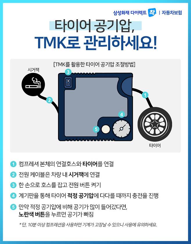 TMK를 이용하면, 정비소에 가지 않더라도 쉽게 타이어 공기압을 관리할 수 있습니다.
