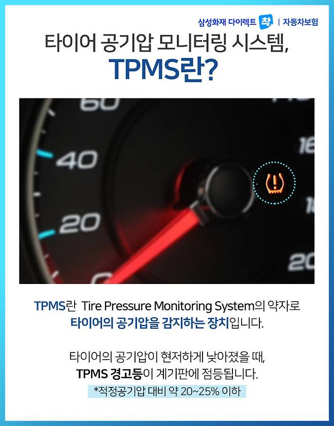 TPMS란 Tire Pressure Monitoring System의 약자로 타이어의 공기압을 감지하는 장치입니다. 타이어의 공기압을 모니터링하여 일정 수중 이하로 낮아졌을 때, 계기판으로 경고 메시지를 보냅니다.