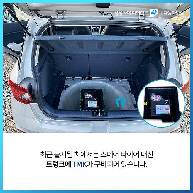 TMK 라는 단어가 생소할 수도 있는데요, 최근 출시된 차에서는 스페어 타이어 대신, 트렁크 밑에 구비되어 있습니다.