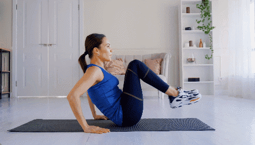 매트에 앉아 손을 바닥에 짚습니다. 두 다리를 공중으로 띄우며 균형을 잡습니다. 상체를 세우며 무릎을 몸 쪽으로 당깁니다. 상체를 뒤로 눕히며 무릎을 펴줍니다.