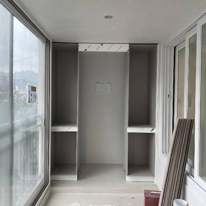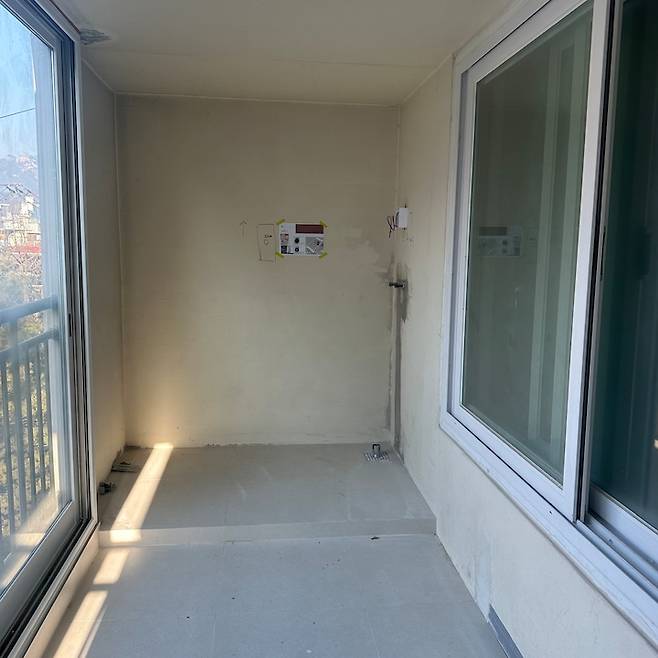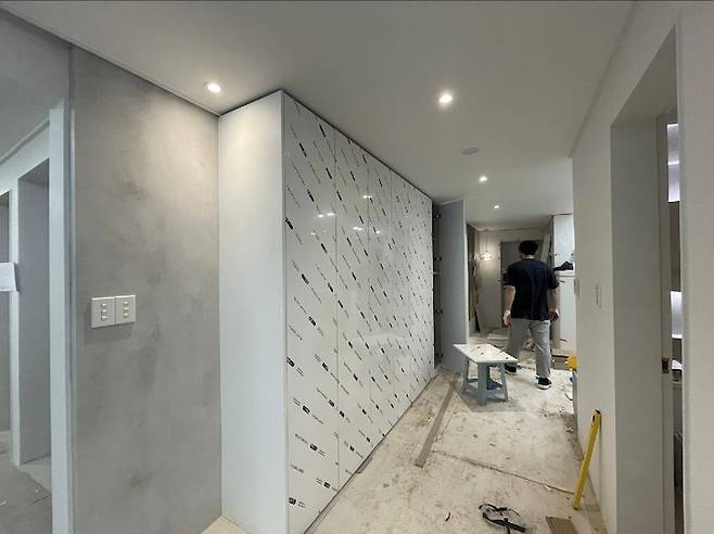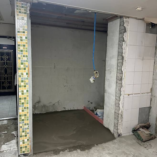 이곳은 공사 중 가장 문제가 되었던 예비(?) 세탁실이에요. 기존에 주방 다용도실에 있던 세탁실로 인해 냉장고를 놓을 공간도, 수납도 충분하지 않았어요. 저는 요리를 좋아하기 때문에 넓은 주방이 꼭 필요했거든요!! 다행히 인테리어 업체 측에서 세탁실 이설공사를 여러 번 해보셨다고 해서 진행할 수 있었어요.