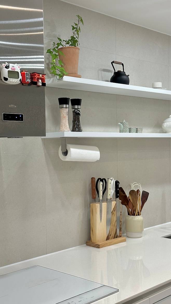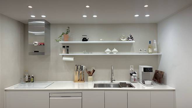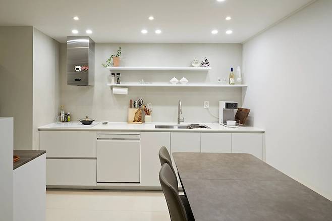 넓이가 좁은 주방은 개방감을 줄 수 있도록 상부장을 없애고 오픈 선반으로 시공했어요. 덕분에 더욱 환해 보이는 주방이 완성되었습니다.