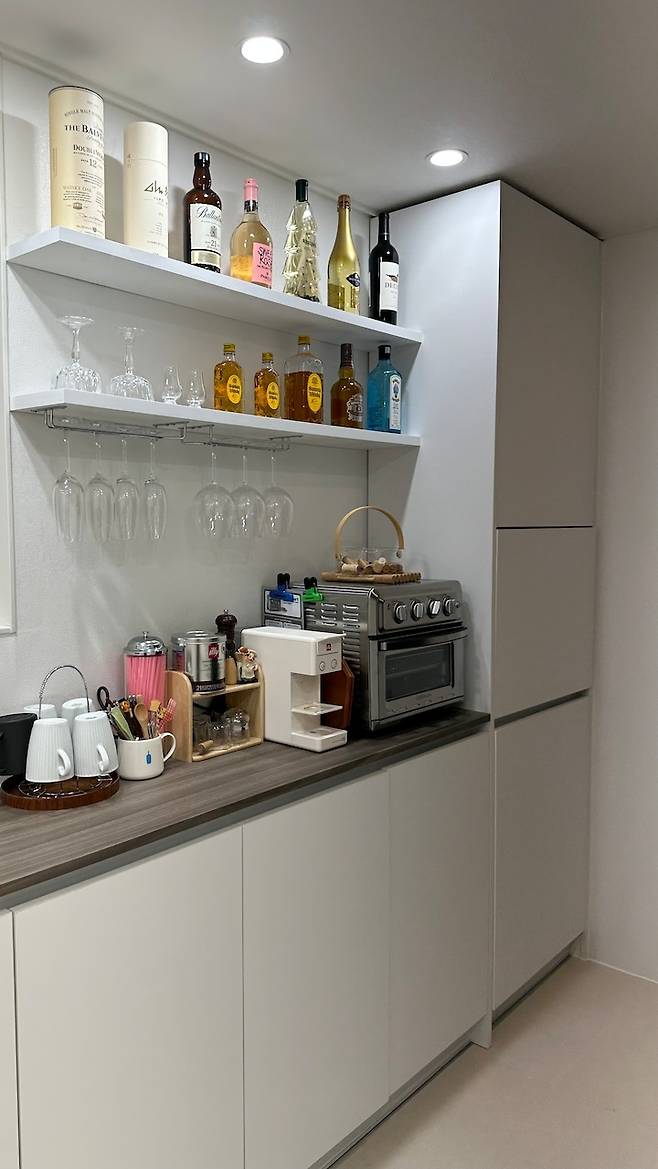 기존 세탁실을 철거하고 홈바를 제작하면서 자주 쓰는 주방 가전은 노출시키고, 부피가 크고 잘 안 쓰는 가전은 플랩장과 레일 수납으로 숨겨서 정리했어요. 일리 커피 머신은 결혼 전 자취할 때 구매해서 벌써 5년째 쓰고 있네요.
