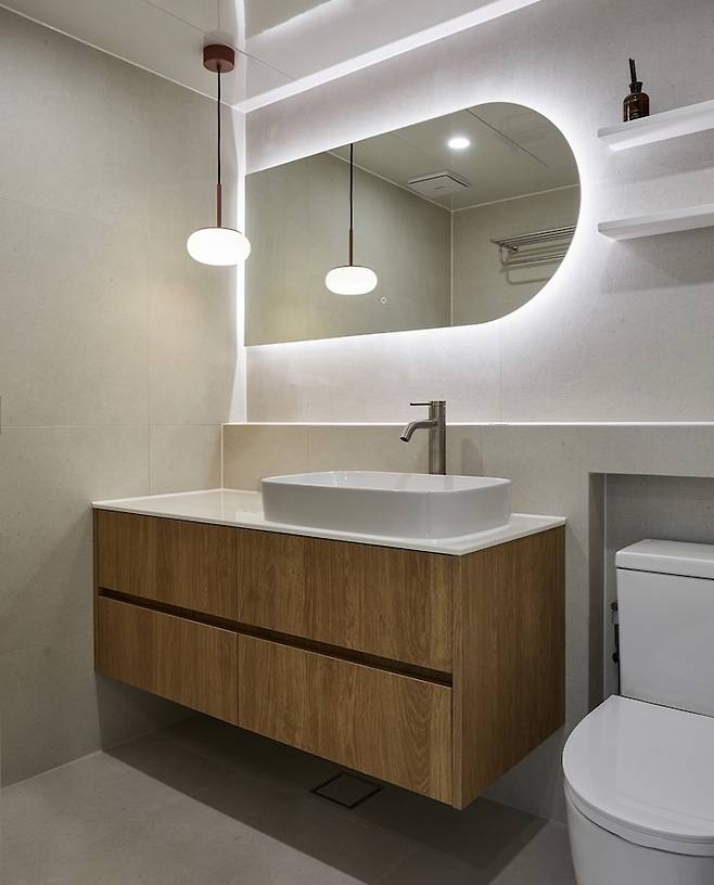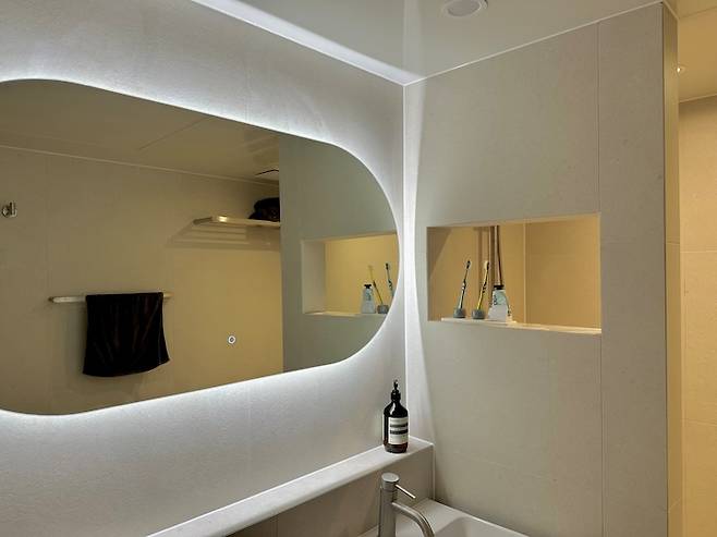 남편은 샤워를 하면서 세수와 양치질을 하고, 저는 세수와 양치질을 먼저 하고 샤워를 하거든요? 항상 여기저기 가있는 치약 찾는 게 싫어서 둘의 생활 습관을 반영하여 조적 벽체 양쪽을 뚫어 그곳에 세면도구를 올려놓았습니다.