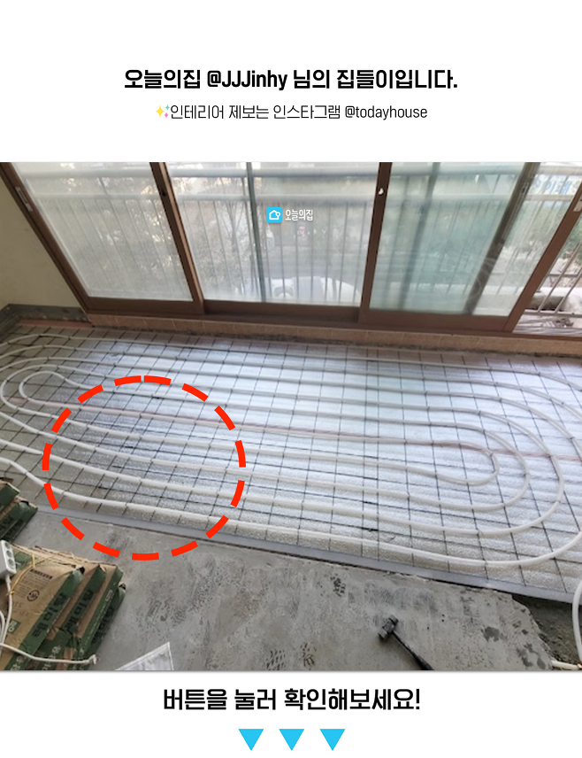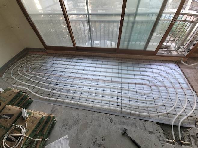 바닥 철거 후 단열재를 깔고 그 위에 난방 배관을 고정, 통미장을 진행했어요!