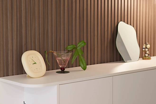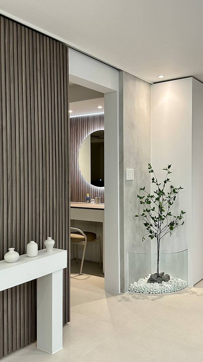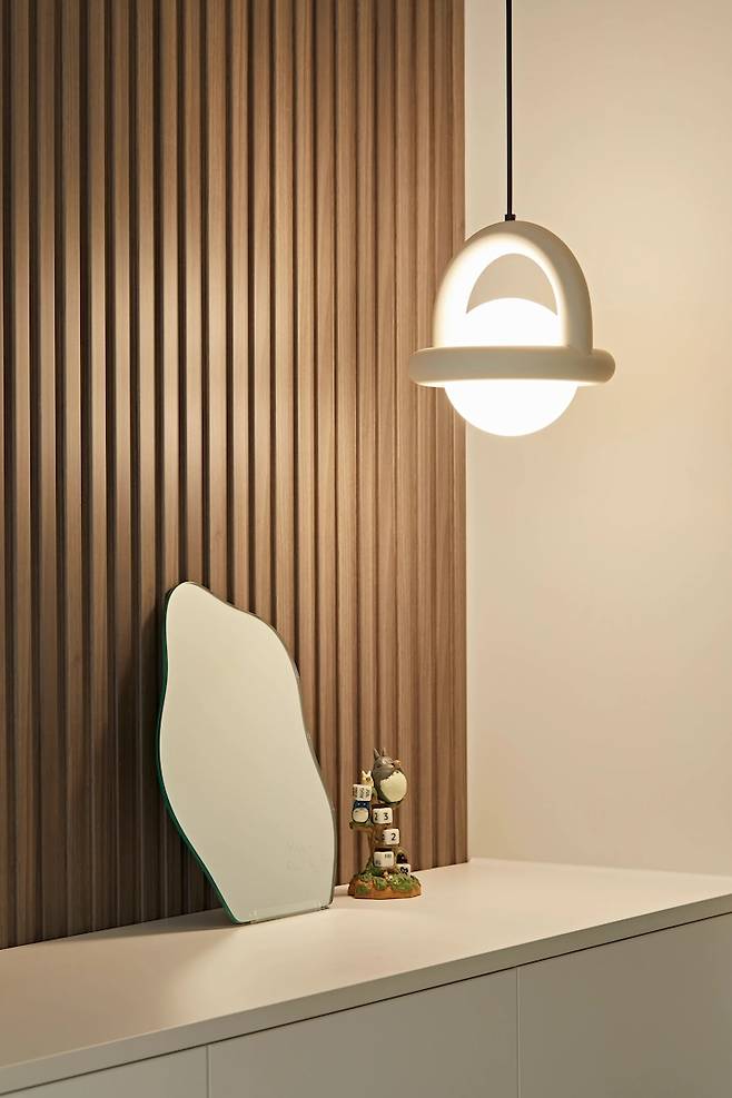 신발장 맞은편 벽에는 전신거울을 설치하고 싶었는데 분전함과 배전반이 모두 매립되어 있어 시공하지 못했어요. 전신거울은 스타일러로 만족하기로 하고 작은 비정형 거울을 놓았어요.