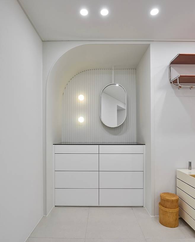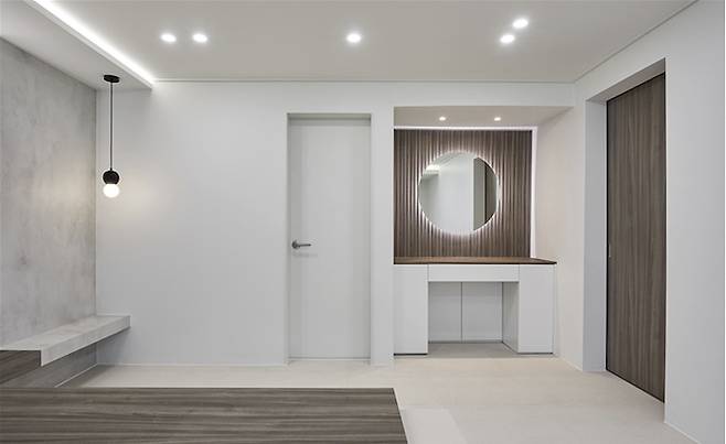 좁은 현관에 개방감을 위해 신발장은 가슴 높이까지만 올렸고 작은방과 이어지는 신발장 코너 부분은 라운드로 오픈해 주었어요.