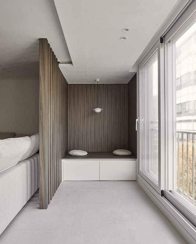 기존 베란다를 확장하고 붙박이장을 철거해 평상을 만들었어요. 이 집의 컨셉인 '카페'같은 집의 핵심 공간이랍니다 ㅎㅎ 베란다를 확장한다고 해서 소파 뒷쪽의 내력벽인 콘크리트 벽을 다 철거할 수는 없어 간살 파티션을 만들어 자연스러운 포인트를 주고 평상 벽은 템바 보드와 간살 도어와 같은 계열의 다크한 시트지로 마감했어요.