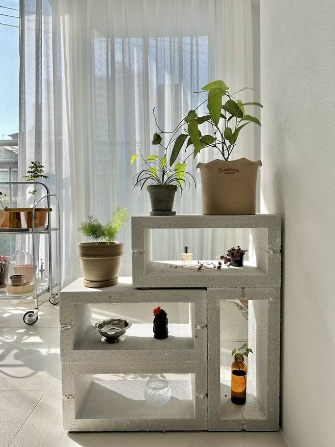 최근에는 예전부터 해보고 싶던 시멘트 블럭을 활용한 플랜테리어존을 꾸며보았어요. 막상 블럭을 배송받고 보니 너무 무겁고 커서 걱정했지만 꾸며 놓고 보니 너무 만족스러워서 하루에도 몇번씩 보게 되는 공간이에요