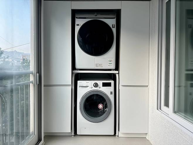그리고 저희는 세탁기와 건조기 제조사가 서로 달라 수직으로 설치하려면 앵글이 필요했어요. 보통 세탁기가 아래 건조기가 위에 올라가는데 앵글 설치가 필요하신 분들은 위에 올라가는 건조기 제조사에 설치 요청하시면 된답니다!