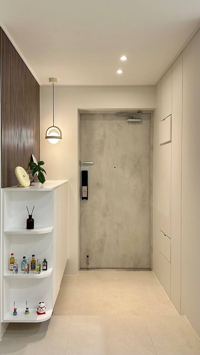 기존에는 현관 한쪽 벽면 전체가 신발장이 있고, 중문이 시공되어 있던 터라 너무 답답해 보였어요. E/L 홀이 복도식이 아니라 냉기가 들어오는 것과 소음은 어느정도 감안하고 과감히 중문을 없앴습니다.