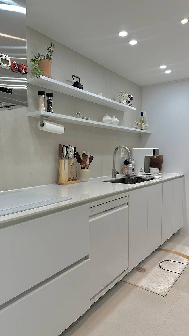 새로 구매한 인덕션과 식기세척기는 모두 LG 오브제컬렉션 라인이에요. 실제 가전이 배송 설치되기 전까지 하부장과 조금은 이색이 지겠지..라고 생각했는데 맞춘 것처럼 색이 같아 너무 만족했습니다! 2인 가족이라 설거짓거리가 그리 많진 않지만 집들이할 때마다 아주 유용하게 쓰고 있어요 ^^