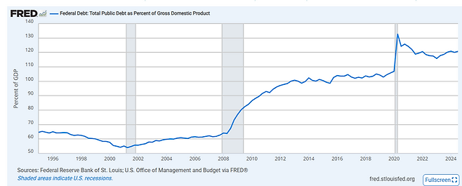 미국 국내 총생산 대비 미국 정부 부채는 이제 120% 수준을 넘어 위험 상태입니다. 2000년 닷컴 거품이 꺼지면서 재정정책을 서서히 피면서 부채 비율이 늘기 시작하였으나 그 정도는 위험 수준은 아닙니다. 그러나 2008년 미국 주택 담보 보증 채권의 거품이 꺼지면서 일어난 경제위기로 미국 실업률이 솟자 대규모로 돈을 풀어 부채비율이 100%를 넘겼습니다. 그리고 코로나 팬데믹 때 다시 엄청난 재정정책을 폈는데 그 여파가 지금까지 미치고 있습니다.그런데 미국 국채는 국내에서 소화되는 물량이 40%가 안 됩니다. 즉 외국 중앙은행이나 투자 기관이 사주지 않으면 더 이상 미국 국채 발행을 늘릴 수 없습니다. 지난 10년 미국 국채 발행하여 돈 풀어서 미국 소비자들이 흥청망청 썼는데 이제 그런 시대도 지나갑니다. 트럼프 당선 이후 미국 국채 금리가 올라간 것에는 중국이 미국과의 무역 전쟁에 대비하여 미리 미국 국채를 팔은 영향도 있다고 합니다. 미국 국민들에게 돈을 풀기 위하여서는 국채를 더 발행하여야 하는데 이제 그러기도 쉽지 아니합니다.