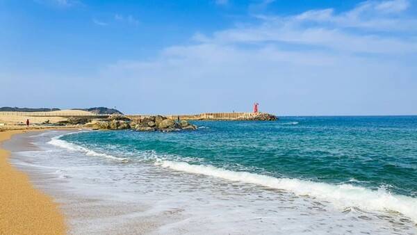 사천해변은 에메랄드빛의 바다와 함께 '곳'이라는 카페의 빵과 음료가 유명해지며 서서히 입소문을 타기 시작했습니다. 카페 '곳'을 방문하기 위한 여행객은 많으나, 사천해변에서 해수욕을 즐기는 관광객은 보기 힘드니 북적이는 인파 걱정은 놓으셔도 됩니다.