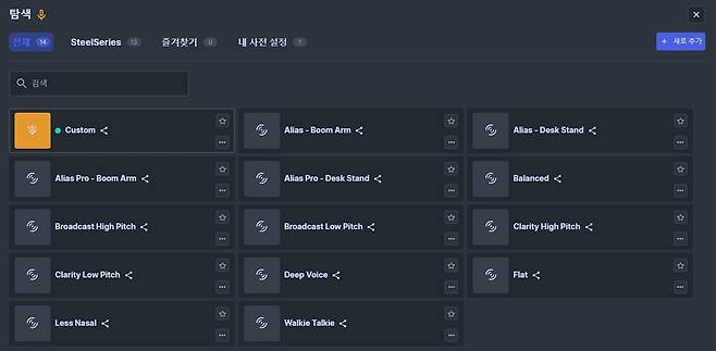 그리고 마이크 설정 역시 비슷하게 가능한데 사전 설정이 존재합니다. 에어리언 보이스나 여러가지 재미있는 프리셋들이 있으므로 다양한 게임 장르에 맞게 활용할 수 있습니다. 마이크 기본 옵션은 AI 설정이 기본이며 AI 노이즈 캔슬링을 지원해서 손으로 톡톡 치거나 말을 해보면 바로 노이즈 캔슬링이 되었다라는걸 느낄 수 있을 정도이며 그만큼 노이즈나 마이크의 울림이 없는 느낌입니다.