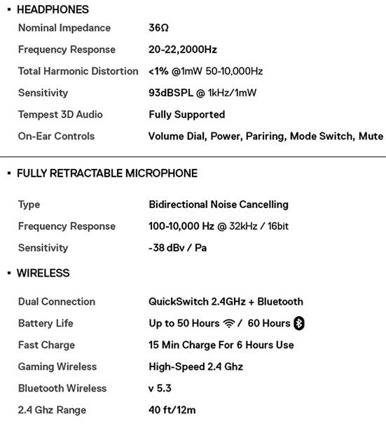 간략된 스펙은 다음과 같은데요. 가벼운 헤드셋 무게의 265g 초경량, 게이밍을 위한 네오디뮴 마그네틱 드라이버, 2.4Ghz 50시간 / 블루투스 60시간의 발전된 배터리 효율 및 고속 충전 지원 등이 있습니다.