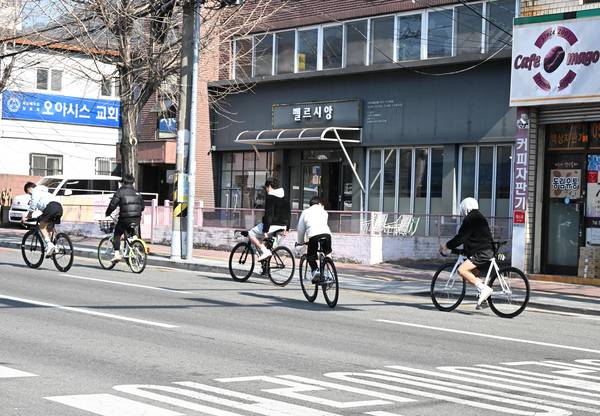 청소년 픽시 자전거 무리가 휘청거리며 도로를 가로지르는 모습은 보는 이의 가슴을 쓸어내리게 합니다.