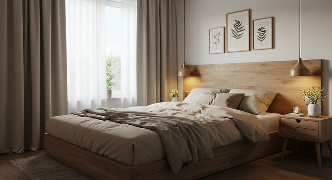 침대의 머리는 벽을 등지고 있어야 편안한 기운을 받을 수 있으며, 만약 구조적으로 창문 외에는 벽이 없다면 두꺼운 커튼이나 헤드보드로 시야를 가려주는 것도 방법입니다.