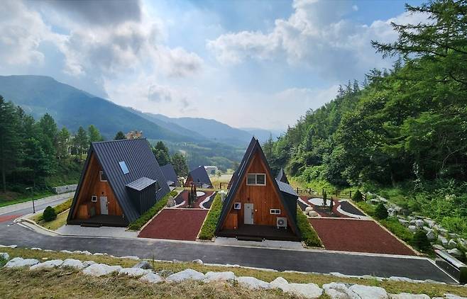 숲속의 집 (독채형): 산비탈을 따라 배치된 통나무집 스타일로, 숲속의 낭만과 프라이빗한 휴식을 원하는 이들에게 안성맞춤입니다. 외관에서 풍기는 이국적인 멋이 일품입니다.