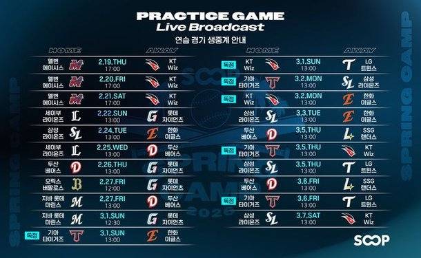 특히 일본 오키나와에서 진행되는 KIA, KT, 삼성의 연습경기는 SOOP 독점 생중계다. 중계진은 장성호, 안경현, 오현택 해설위원과 김태우, 홍석현, 강승완, 김상엽 캐스터가 참여한다. KIA와 KT는 각 구단 공식 SOOP 방송국을 새로 개설해 해당 채널에서도 별도 생중계할 예정이다. 오릭스, 세이부, 지바 롯데 등 일본 퍼시픽리그 구단과의 한일 맞대결도 중계 대상에 포함됐다.