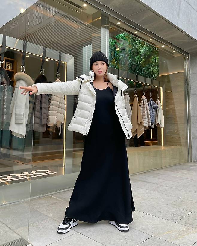 다음은 블랙 슬립 드레스에 화이트 패딩,