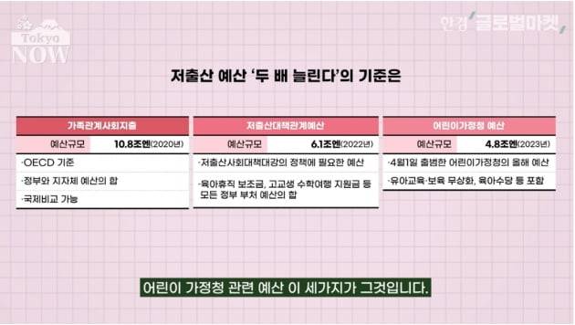 차원이 다른 저출산 정책을 통해 일본 정부가 두 배로 늘리려는 예산은 3가지로 추정된다. ▲총리가 언급한 가족 관계 사회지출 ▲저출산 대책 관계예산 ▲어린이가정청 관련 예산이 그것이다.