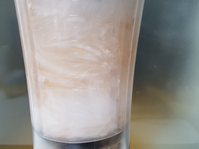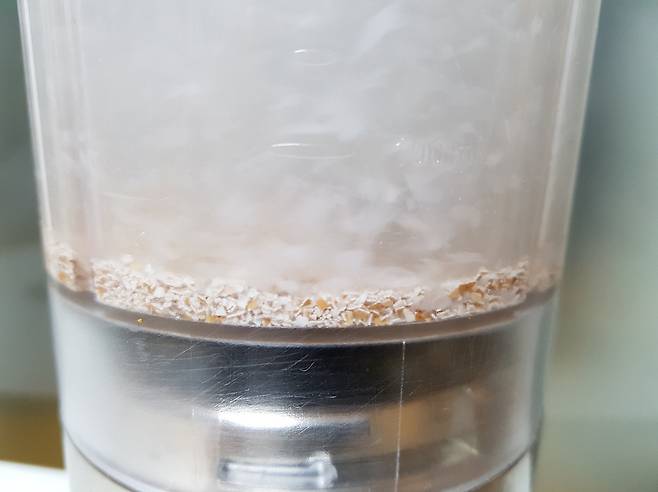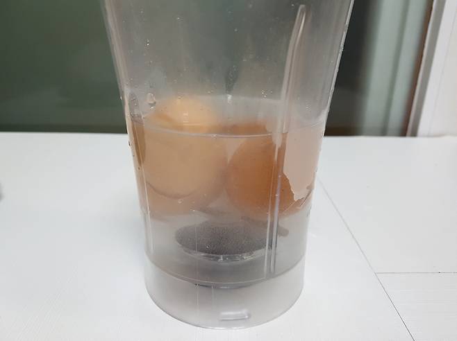 믹서기의 세기를 가장 강력하게 조절한 후 1분 동안 계란 껍데기를 갈아주세요.