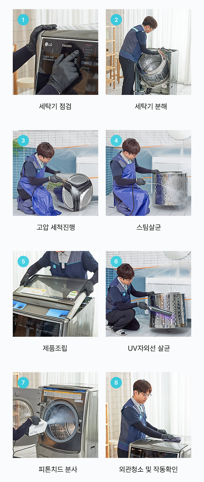그 후 고압세척 → 스팀살균 → 제품 조립 → UV 살균 → 피톤치드 분사 → 외관 청소 및 작동 확인 순서대로 진행이 되어요.