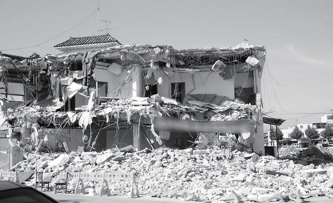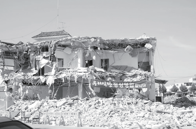 6. 제시된 사진은 무너진 건물에 플래카드가 붙어 있는 장면이다. 플래카드에 적힌 문구 ‘우리 식당 정상 영업합니다’가 무너진 건물과 대조를 이루며 웃음을 자아낸다. 상황이 좋지 않지만 어떻게든 일이 되어가는 모양을 설명할 때 주로 사용하는 사진이다. ①은 ‘외계인 침공 시 살찐 사람이 먼저 잡아 먹힌다’라는 다이어트 홍보물 문구에서 유래한 밈이다. ③은 예능 프로그램 <무한도전>의 출연진 광희가 영화를 더빙하는 장면에서 한 말이다. 힘 없는 목소리와 적절한 자막으로 화제가 됐다.