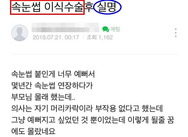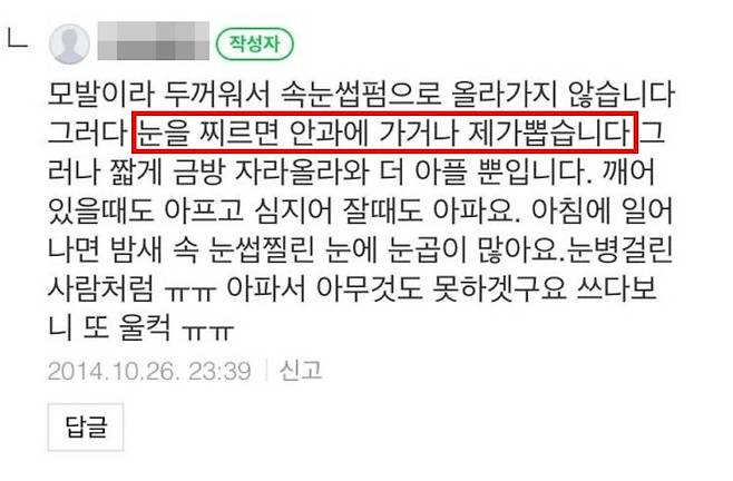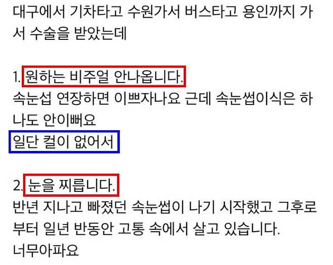 이식한 부분을 다시 제거할 수도 없어서 속눈썹이 자꾸만 눈을 찌른다면 안과에 가서 속눈썹을 지져야한다고 하네요.
