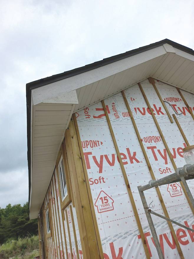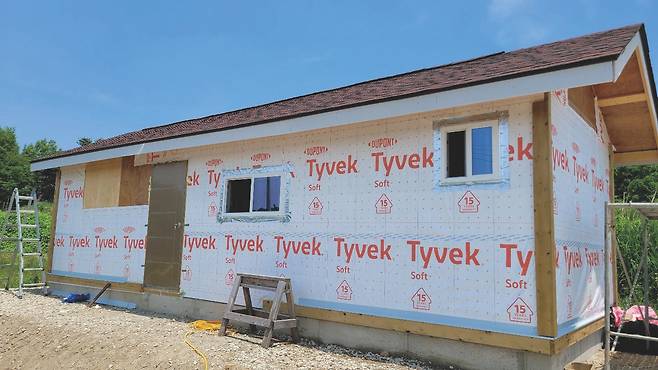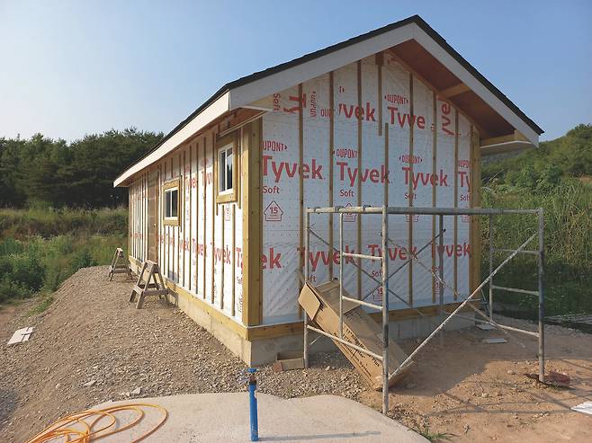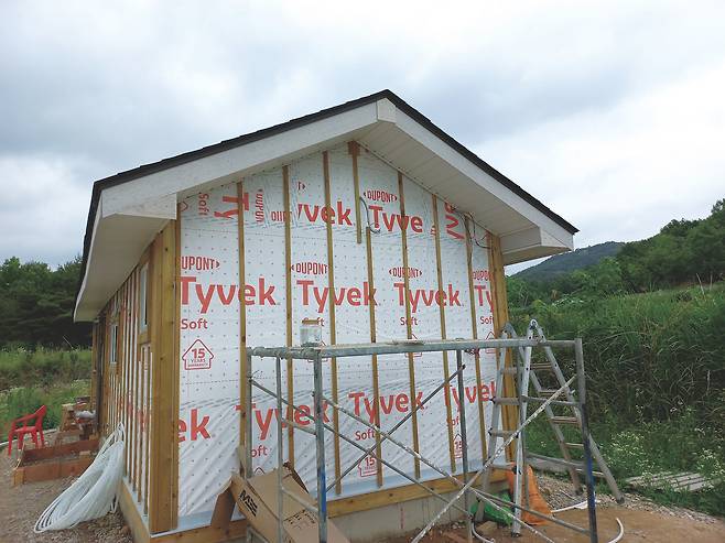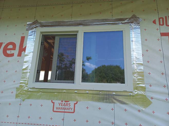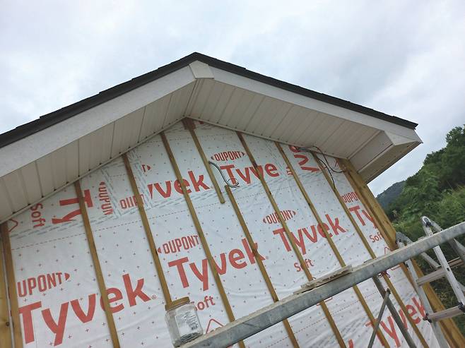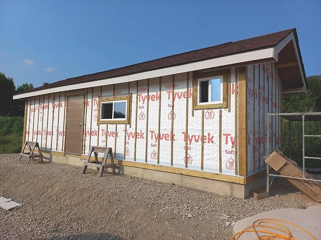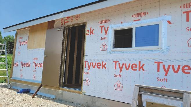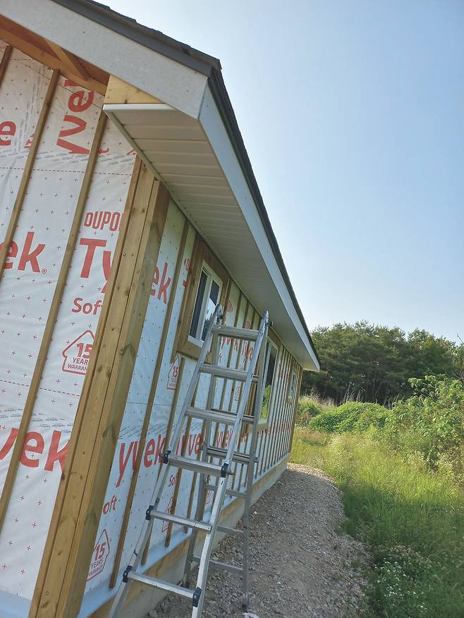 나는 고민하다 다음에 실내 문을 설치할 때 현관문을 다시 달아 달라고 했고, 김 사장은 그렇게 하기로 했다. 2번 벽체 외벽 마무리도 현관문 재설치 뒤로 늦출 수밖에 없었다. 이후 건축물의 모서리와 아랫부분에 재료분리대 설치 작업을 마무리하고 그 위에 빗물 차단용 후레싱을 덮었다. 방수용 타이백이 비어 있던 외벽에도 목수 학원에서 구해 간 자투리 타이백으로 덮었다. 그렇게 작업을 마치고 좀 허탈한 마음으로 숙소로 향했다.