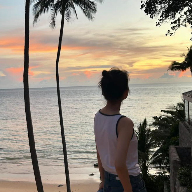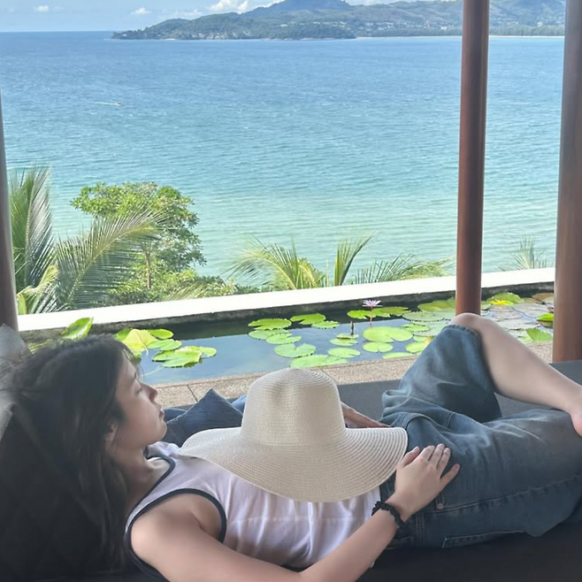 그녀가 머문 곳은 바다 앞 작은 숙소. 화장기 없는 민낯, 흰색 민소매와 청반바지, 그리고 어깨에 툭 걸친 셔츠 하나로 완성된 바다 풍경 속 실루엣은 ‘아이유다움’ 그 자체였다.