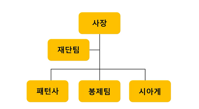 한국봉제공장 시스템은 재단팀, 패턴실, 봉제팀, 시아게로 업무가 나눠져 있어요. 재단사는 입고된 원단을 확인하고 자르는 일을 담당하고, 패턴사는 옷의 패턴을 만드는 일을 합니다. 봉제팀은 재단사가 재단한 원단을 직접 이어붙여서 옷으로 만드는 일을 하죠.
