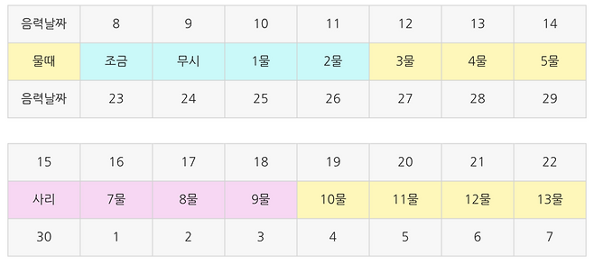 바다의 물때는 달과 관련이 있어서 음력날짜를 기준으로 합니다.