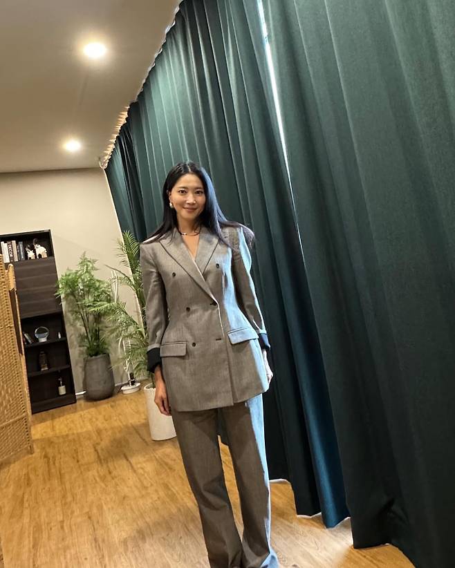 오윤아가 그레이 오버사이즈 수트로 파워풀한 오피스 룩을 완성하고 있다. 더블 버튼 디테일의 넉넉한 실루엣 재킷과 와이드 팬츠의 조합은 트렌디한 오버사이즈 수트 스타일을 완벽하게 소화하고 있다. 재킷 안에 별도의 이너웨어 없이 과감한 연출로 세련미를 더했으며, 심플한 목걸이로 포인트를 주어 미니멀하면서도 시크한 분위기를 자아내고 있다. 그린 커튼과 우드 플로어의 배경은 그레이 수트의 컬러감을 더욱 돋보이게 하며 도시적인 세련미를 극대화하고 있다.
