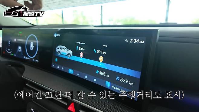 계기판은 한눈에 보기 쉽게 현재 충전량(84%)과 주행 가능 거리(485km)를 보여줍니다. 에어컨을 끄면 539km까지도 주행 가능하다고 나와서 놀랐습니다.