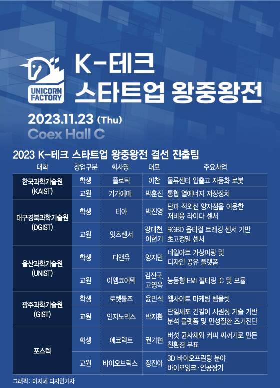 머니투데이 스타트업 미디어 플랫폼 유니콘팩토리가 주관하고, 과학기술정보통신부가 후원하는 K-테크 스타트업 왕중왕전은 R&D(연구·개발) 기술이전·사업화 촉진과 함께 유망 딥테크 스타트업 성장, 지역 혁신성장 생태계 구축 등을 지원하기 위해 마련한 행사로 지난해에 이어 올해가 두번째다. 이번 대회 본선엔 한국과학기술원(KAIST), 대구경북과학기술원(DGIST), 울산과학기술원(UNIST), 광주과학기술원(GIST), 포스텍(옛 포항공대) 등 국내 5대 과학기술특성화대학의 기술사업화팀·산학협력팀·창업진흥센터 등이 1차로 엄선한 교원·학생 창업기업 총 21개팀이 출전했다.