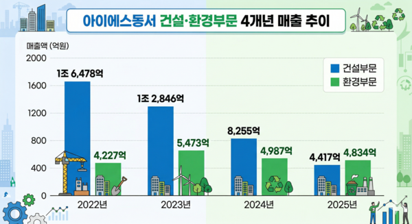 9일 금융감독원 전자공시시스템에 따르면 아이에스동서의 지난해 연결기준 전체 매출액 1조2343억원 가운데 환경 부문은 4834억원을 차지했다. 과거 절대적인 현금창출원이었던 건설 부문 매출이 2024년 8255억원에서 4417억원으로 46.5% 감소하며 환경 부문에 1위 자리를 내줬다.