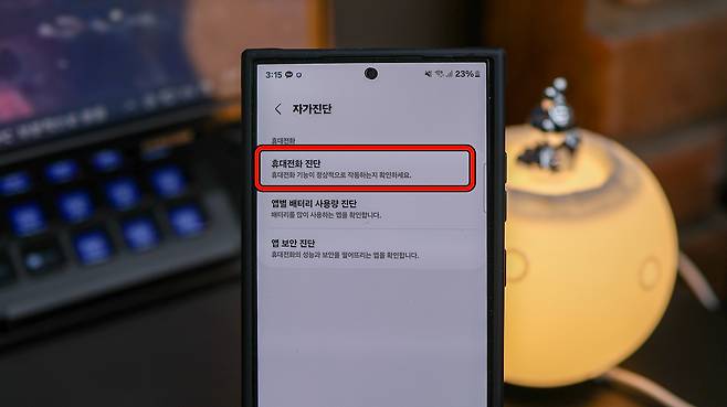 3). 휴대전화 진단 메뉴 선택: 자가진단 메뉴에서 휴대전화 진단을 선택하면 배터리 상태를 포함한 다양한 진단 항목을 볼 수 있다.