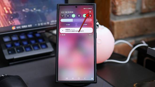 1). 설정 메뉴 열기: 화면 상단에서 아래로 스크롤하여 우측 상단에 위치한 톱니바퀴 모양의 설정 아이콘을 탭한다.