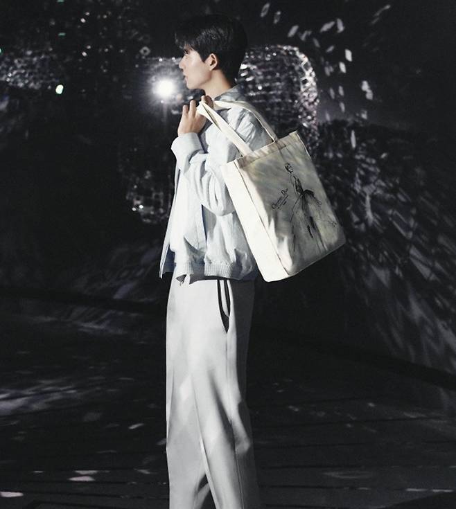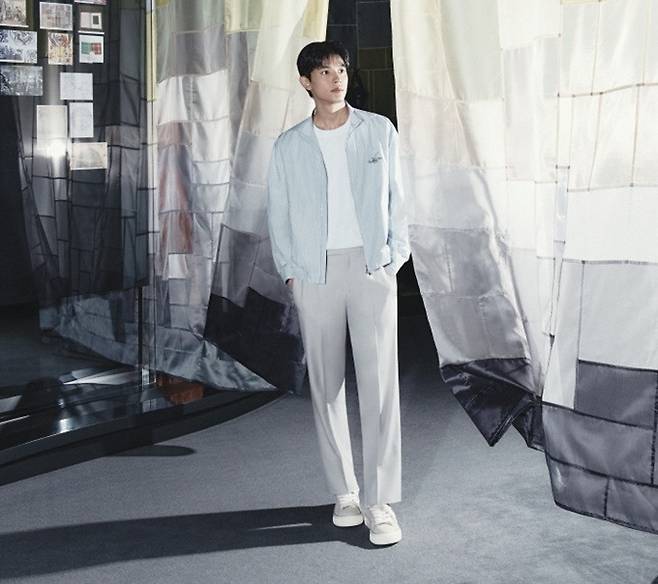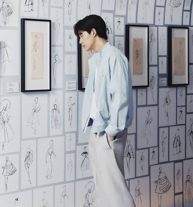 로몬은 모던하면서도도시적인 감각의 블루종 재킷과 루즈 핏 팬츠, 타임리스한 테니스 슈즈를 매치한 댄디한 프레피룩으로 전시회의 여러 공간을 감상했다.