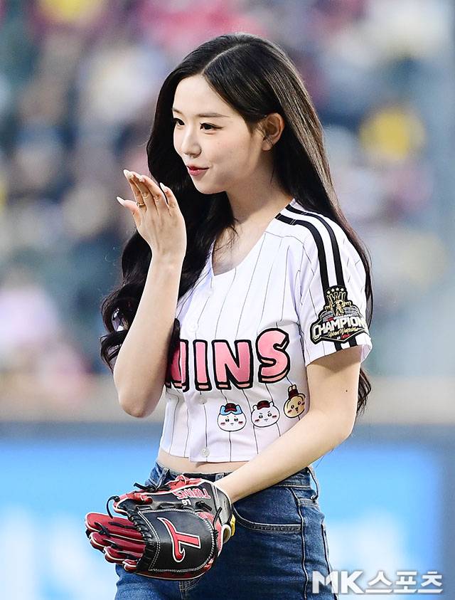경기에 앞서 걸그룹 트리플에스 김채연이 시구를 하고 있다.