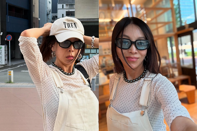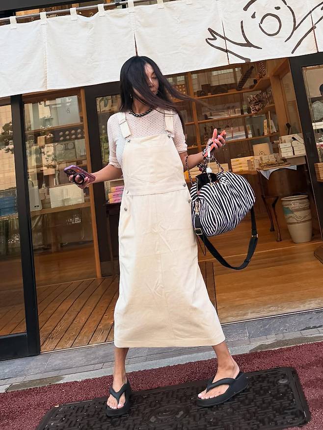 아이보리 톤의 멜빵 팬츠에 잔잔한 도트 무늬 상의를 매치해 사랑스러운 캐주얼룩을 완성했다.