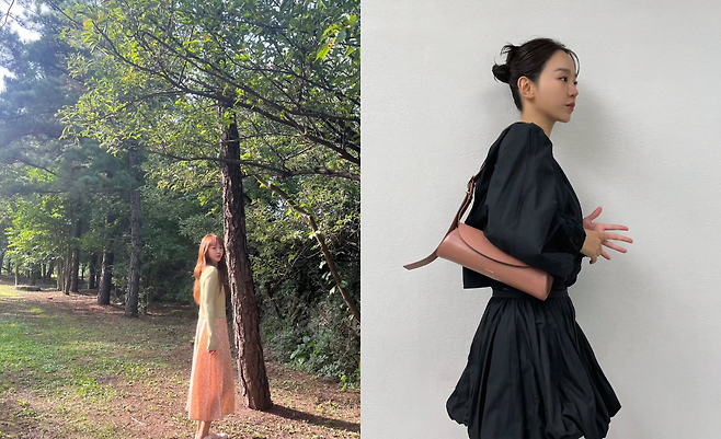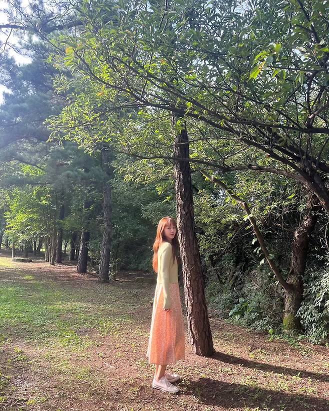 공원에서 촬영된 사진에서 신혜선은 오렌지 톤의 플리츠 원피스로 따뜻하고 여성스러운 분위기를 연출하고 있다. 미디 길이의 원피스는 자연스러운 A라인 실루엣으로 우아함을 더하며, 아이보리 컬러 상의와의 조화로 부드러운 그라데이션 효과를 만들어내고 있다. 녹음이 우거진 배경과 어우러져 자연스럽고 편안한 매력을 보여주고 있다.