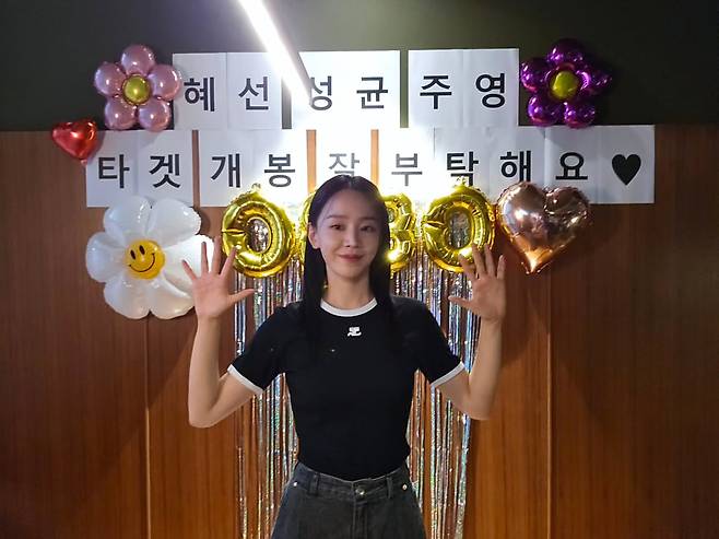 생일 축하 파티장에서 신혜선은 블랙 티셔츠와 데님 팬츠로 심플하면서도 깔끔한 스타일링을 연출하고 있다. 화려한 풍선 장식과 대비되는 절제된 컬러 선택으로 세련미를 강조했으며, 자연스러운 스타일링으로 편안한 분위기를 자아내고 있다.