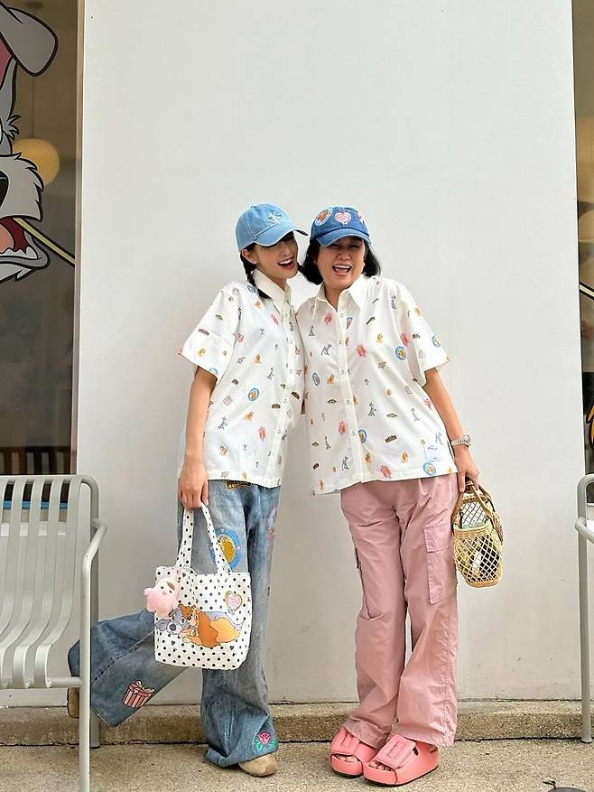 민니가 선택한 셔츠는 ‘레이디와 트램프’ 캐릭터가 총집합한 화이트 반팔 셔츠로, 자잘한 일러스트 패턴이 경쾌한 키치무드를 연출한다. 함께 매치한 데님 롱스커트에는 애니메이션 모티브의 자수가 곳곳에 더해져, 마치 스토리북 한 장면처럼 독특한 분위기를 자아낸다. 반면 어머니는 같은 셔츠에 핑크톤 팬츠를 매치해 더욱 화사한 느낌을 더했다.