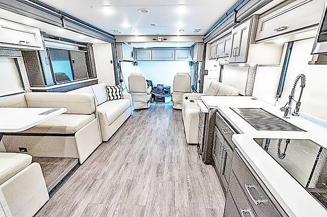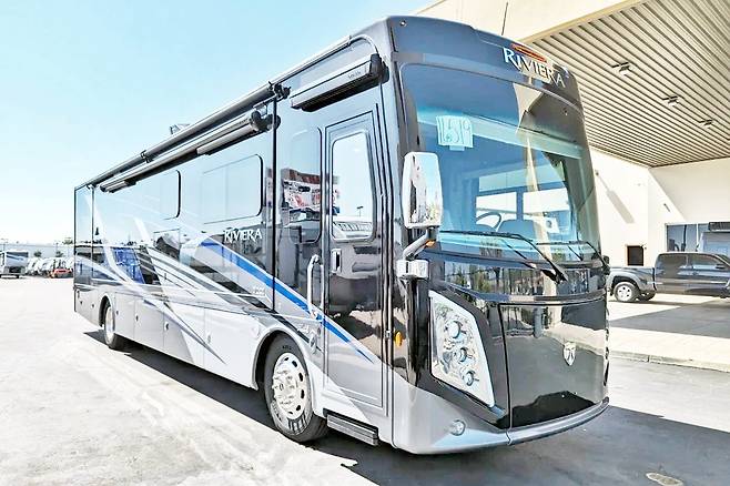 2024년형 리비에라 38RB는 6인승을 상정하고 설계됐으며, 3개의 확장형 슬라이드 구조를 통해 주거 공간을 확장할 수 있다. 내부에는 68인치 대형 소파 2개와 접는 기능을 내장한 킹사이즈 침대, 세탁기와 건조기가 결합 가전 세트가 갖춰져 있다. 주방은 고급 빌트인 가전과 대리석 마감재로 꾸며져 있어 모터홈을 연상하기 어려울 정도로 고급스럽다.