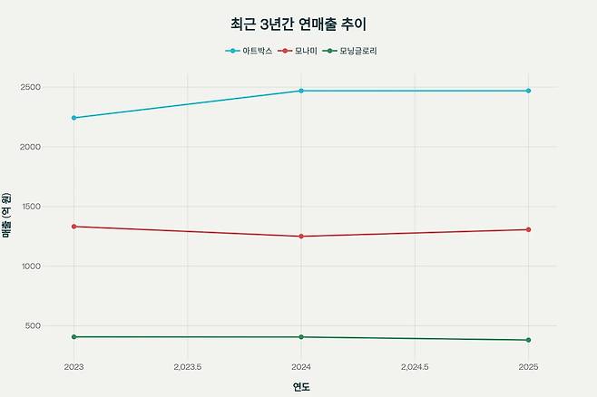 아래 그래프는 최근 3년간 아트박스, 모나미, 모닝글로리 연매출 변화를 보여준다. 차트는 애플 키노트 스타일로 제작되었으며, '억 원' 단위다.